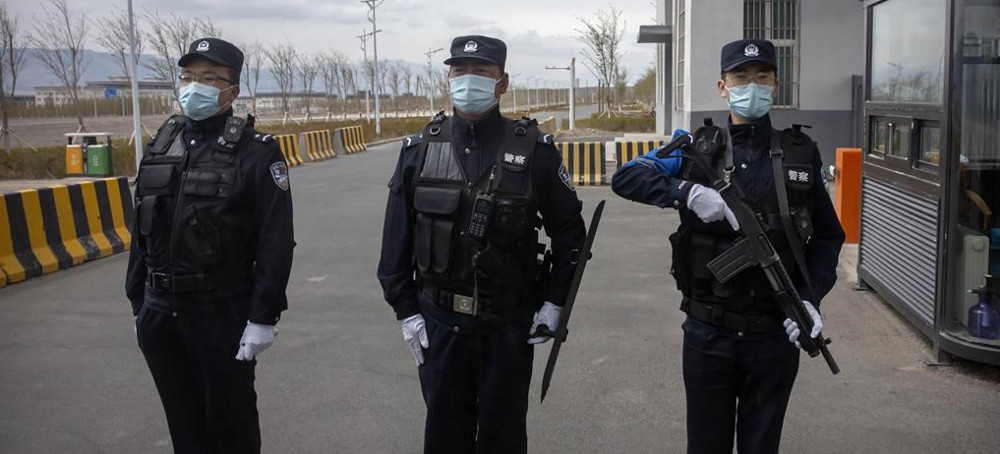 Police officers stand at the outer entrance of the Urumqi No. 3 Detention Center in Dabancheng in western China's Xinjiang Uyghur Autonomous Region, April 23, 2021. (photo: Mark Schiefelbein/AP)