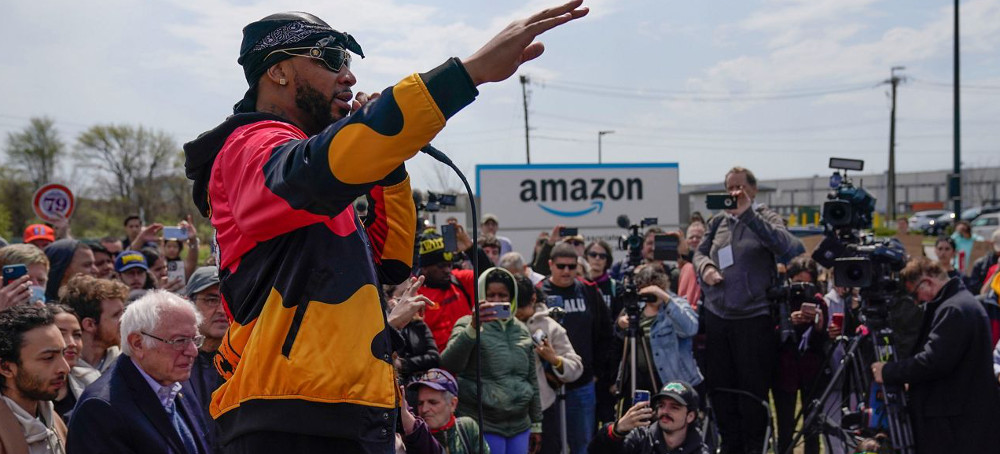 Christian Smalls, president of the Amazon Labor Union, speaks at a rally outside an Amazon facility on Staten Island in New York, Sunday, April 24, 2022. (photo: Seth Wenig/AP)