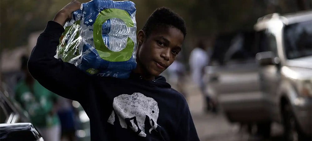A volunteer carries bottles of water at a water distribution site as the city of Jackson, Mississippi. (photo: Carlos Barría/Reuters)