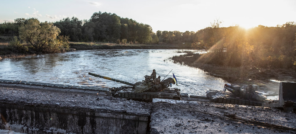 Ukrainian forces on a tank pass a pontoon bridge over the Oskil River in the Kharkiv region on Oct. 3. (photo: Heidi Levine/The Washington Post)