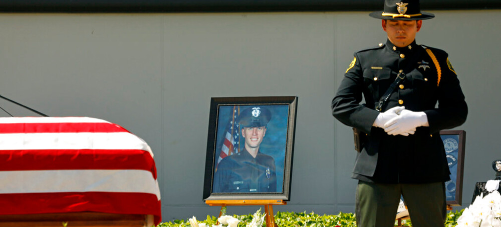 A picture of Los Angeles Police Officer Houston Tipping is set on the deck where his memorial was held at Forest Lawn Hollywood Hills on Wednesday, June 22, 2022, in Los Angeles. (photo: Carolyn Cole/Los Angeles Times)