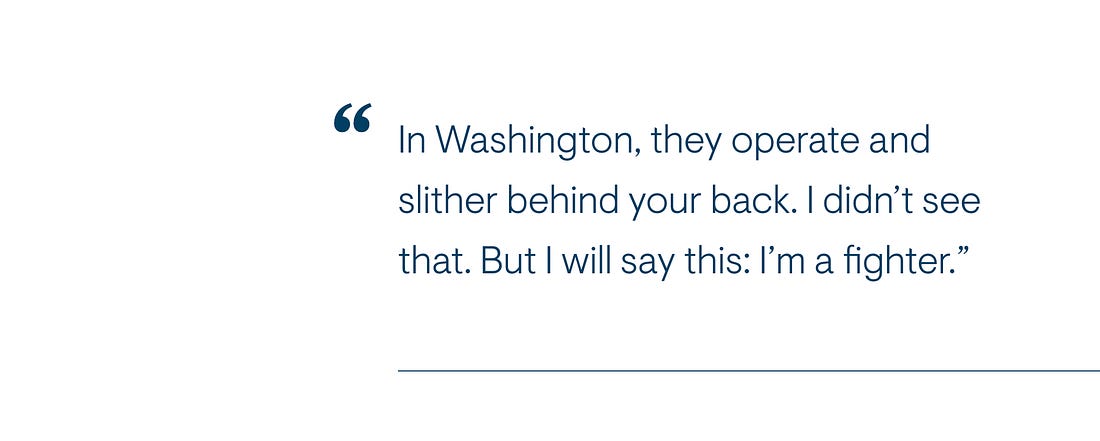 That’s the back-stabbing culture of Washington. I’m an entrepreneur, so I’m trying to disrupt that level of communication in Washington. I’d like to front-stab people. I’d like to be on the record, tell you exactly how I feel about you. You can feel that way about me, you can dislike me, but what happened to me in Washington is I got the Howdy Doody smile. I got the Richie Cunningham, “ha ha, he he, I love you.” And then they were putting the shivs in my back, and they were running around trying to do nefarious, dishonest things.