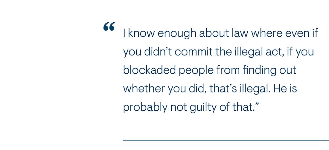 I don’t think so. But I do know enough about the law where even if you didn’t commit the illegal act, if you blockaded people from finding out whether you did, that’s illegal. I predict that he is probably not guilty of that either. I don’t necessarily know, but the president is well intended. He is a New Yorker. He wears his heart on his sleeve. This is a tough guy not to see through. He’s got a level of transparency about him, so I don’t think he has done anything that dishonest. I actually believe that.