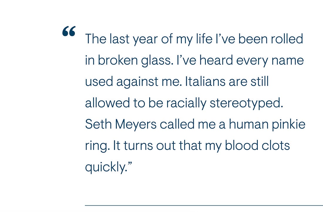 Amen. I’m not throwing any stones at anybody. You enter the political arena, you’re going to get rolled in broken glass. So the last year of my life I’ve been rolled in broken glass. It turns out that my blood clots quickly. I’ve heard every name used against me. Italians are still allowed to be racially stereotyped and profiled in our country. Seth Meyers called me a human pinkie ring, Jim-Tan laundry, Pauly in the Press Room, Tony Goomba takes over the Press Shop…I’ve heard everything. I don’t care, I’m a First Amendment guy. I’m one of the Italians who doesn’t care about The Sopranos or Goodfellas or any of that other stuff. My attitude is, you know I’m educated, I worked my ass off, I want to honor my mom and dad.