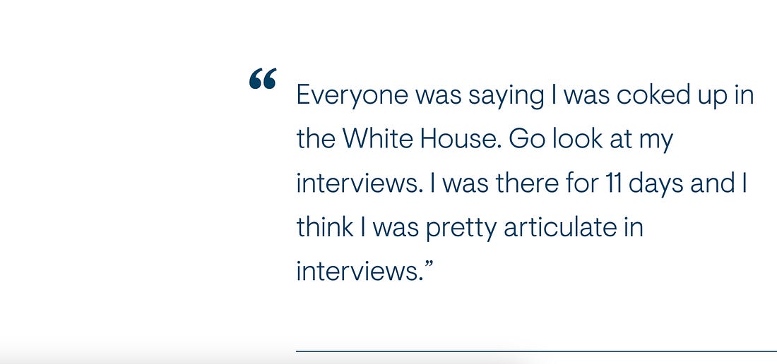 I have never on the Bible, before my god, I’ve never smoked pot or snorted a line of coke. You can ask anybody who knows me. Everyone was saying I was coked up in the White House. Go look at my interviews. I was there for 11 days and I think I was pretty articulate in interviews. I made one mistake with Ryan Lizza.
