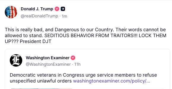 We have extraordinary and alarming developments this morning. President Trump is openly targeting Democratic lawmakers who released a PSA reminding U.S. service members that they must refuse illegal orders. He is not just calling for them to be fired or investigated. He has reposted demands that they be arrested, tried, and even “hanged.” The sitting President of the United States is now amplifying calls for the death of elected officials for urging the military to follow the law.